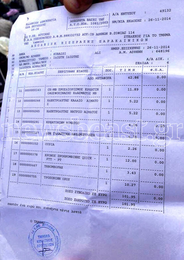 | Στην καταγγελία ότι τους ζητήθηκαν χρήματα για τη νοσηλεία συμπατριωτών τους σε νοσοκομεία, έπειτα από τα λιποθυμικά επεισόδια που σημειώθηκαν λόγω της απεργίας πείνας, προχώρησαν σήμερα οι Σύροι πρόσφυγες που… διαμαρτύρονται για δεύτερη συνεχή εβδομάδα στην πλατεία Συντάγματος απέναντι από τη Βουλή. Παρουσίασαν μάλιστα ένα έγγραφο-τιμολόγιο, σύμφωνα με το οποίο θα πρέπει να πληρωθούν συνολικά 101 ευρώ σε ιατρικά έξοδα στο Ιπποκράτειο Νοσοκομείο. ![]() (ΝοΝews.gr) |