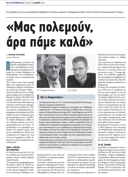 Δημήτρης Ζιαζιάς, πρόεδρος Ε.Ι.Ν.Α, 14/05/20